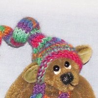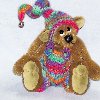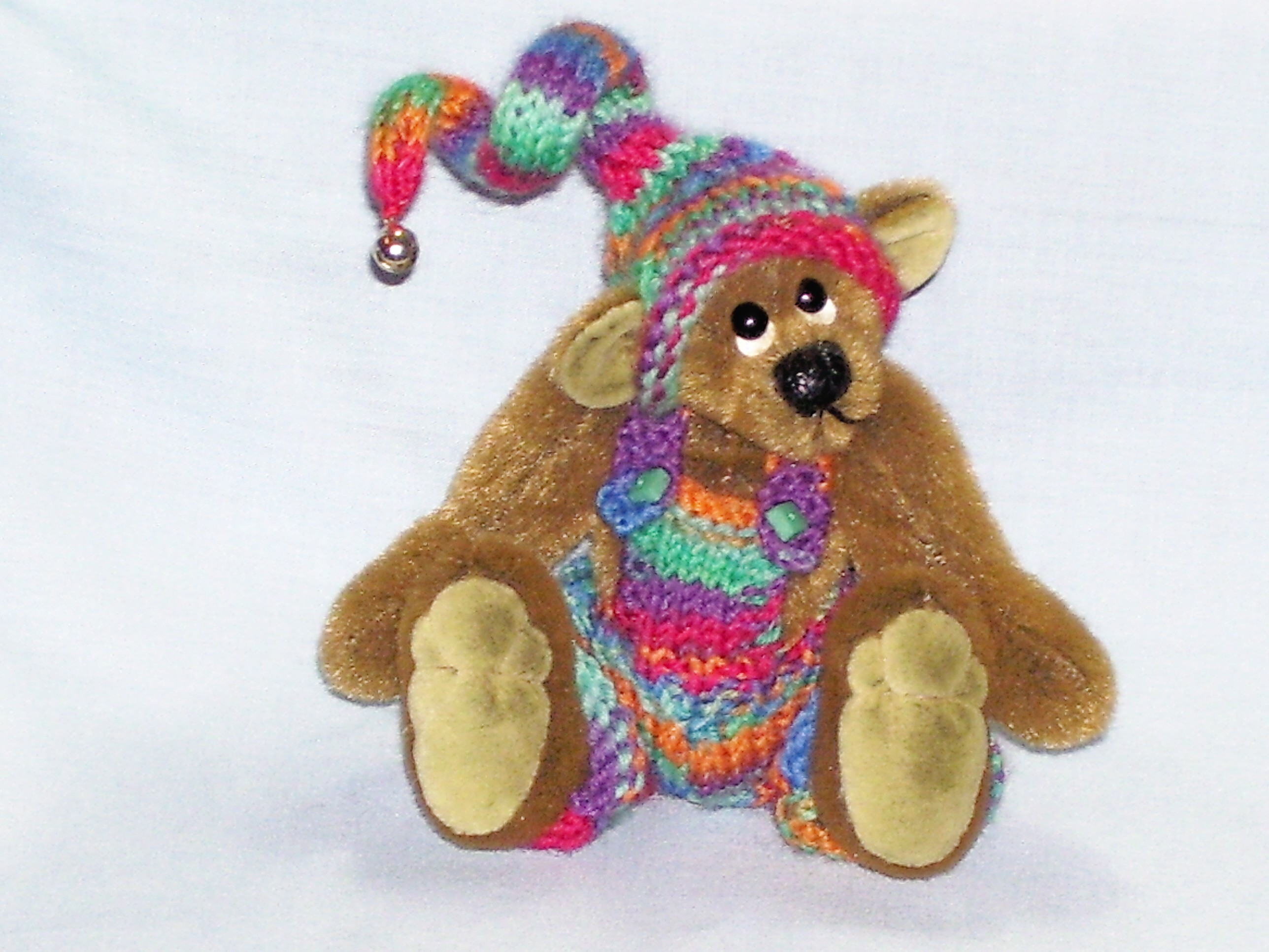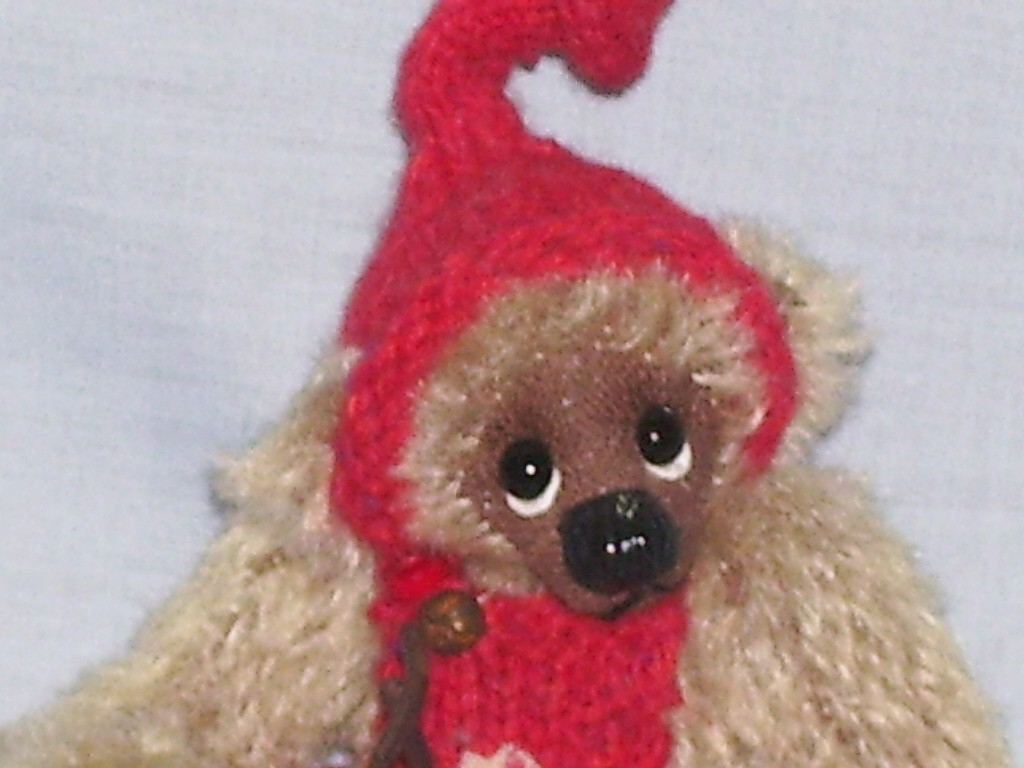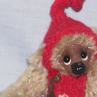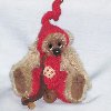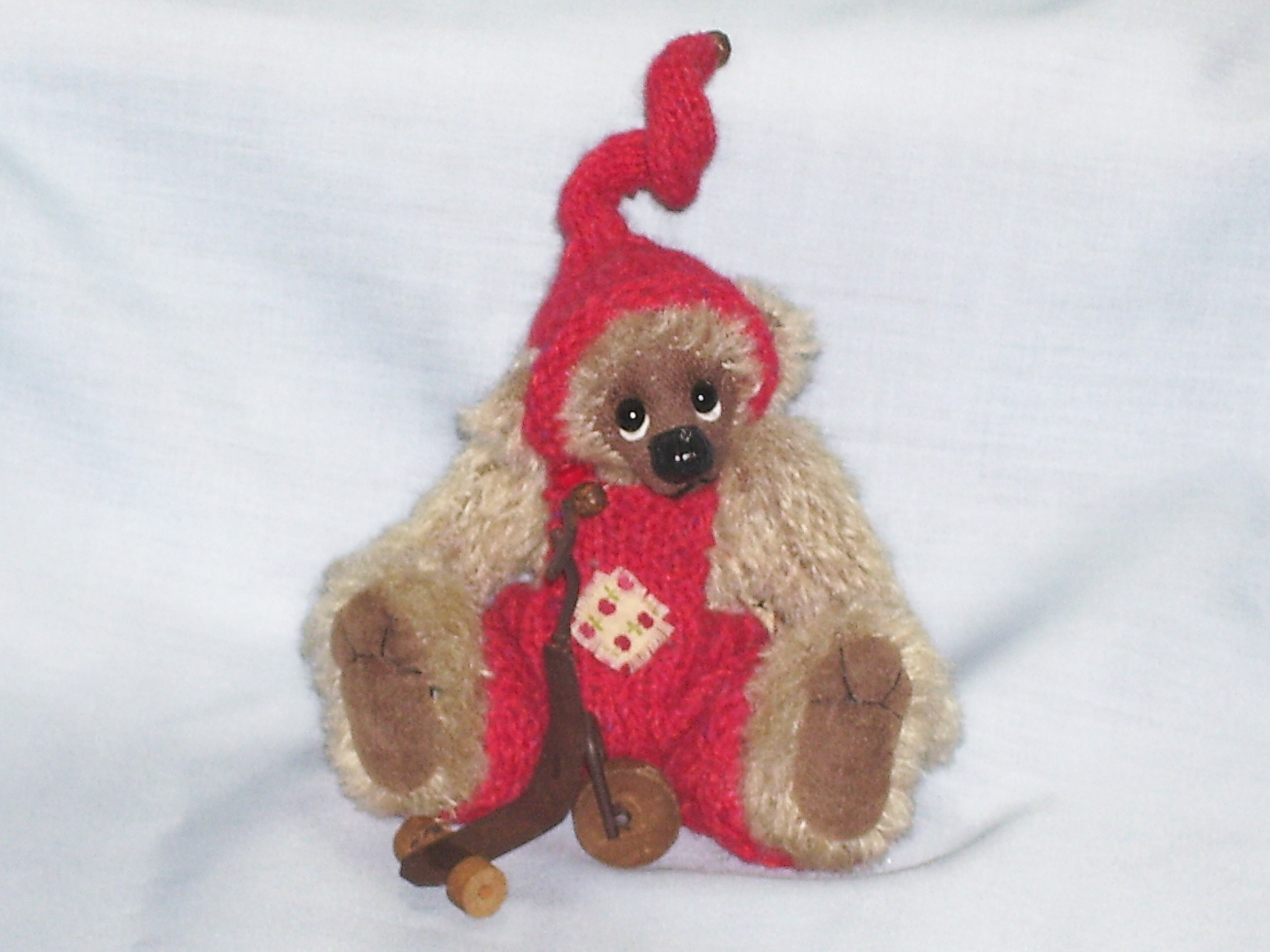 Ozzy is a lively little fellow that loves nothing more than playing with his scooter. He is 3.5" in height from sitting. He is made from semi sparse german sculte mohair and has ultra suede paws that have been needle sculpted. Ozzy is weighted with glass beads, has glass eyes and a hand sewn nose that is glossed. He wears red hand knitted dungarees and matching curly hat. Ozzy has an antiqued bell around his neck and comes with an antiqued scooter. Adoption Fee : SORRY OZZY HAS BEEN ADOPTED