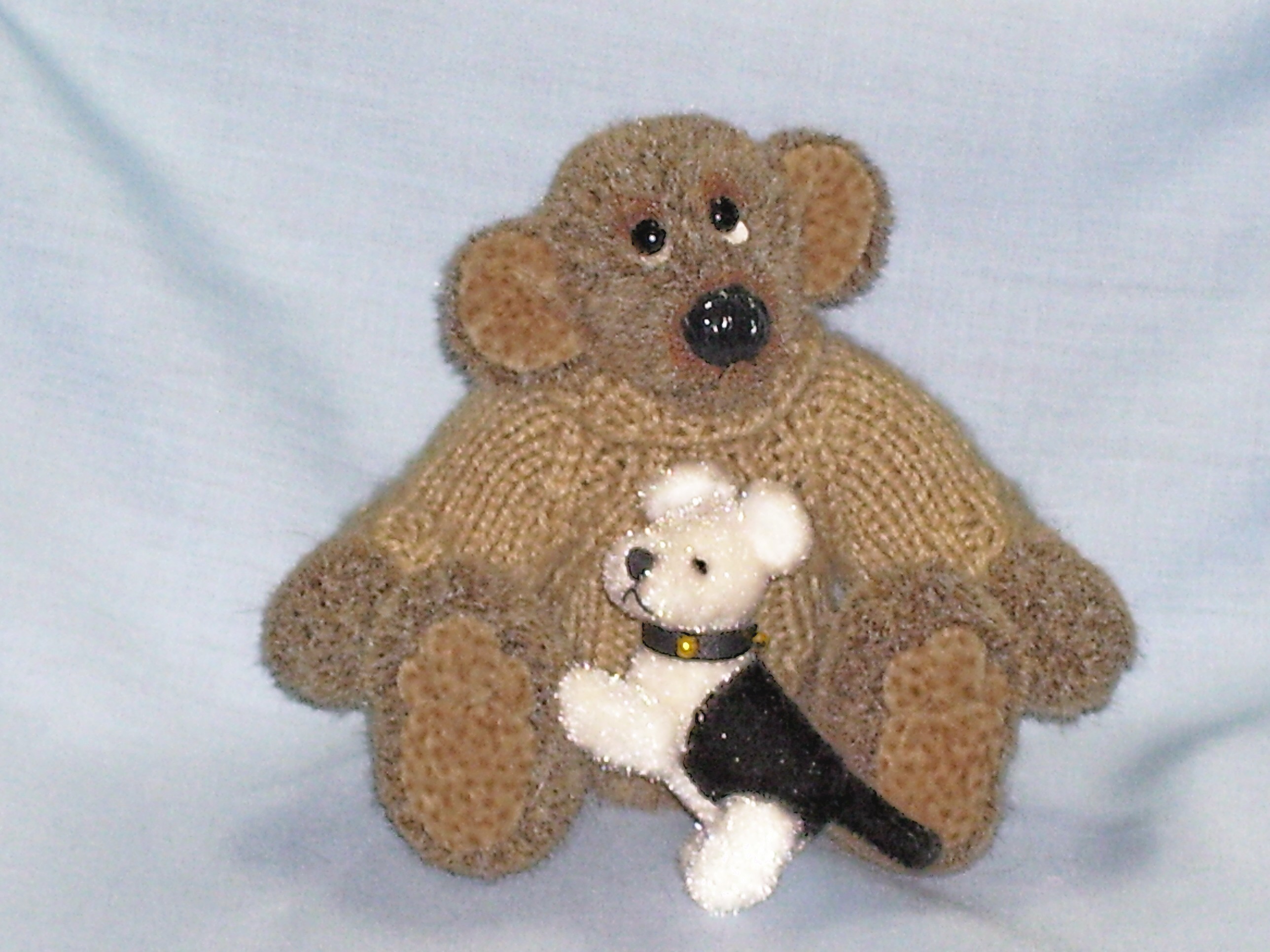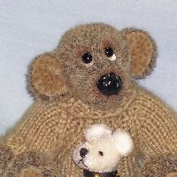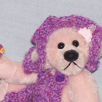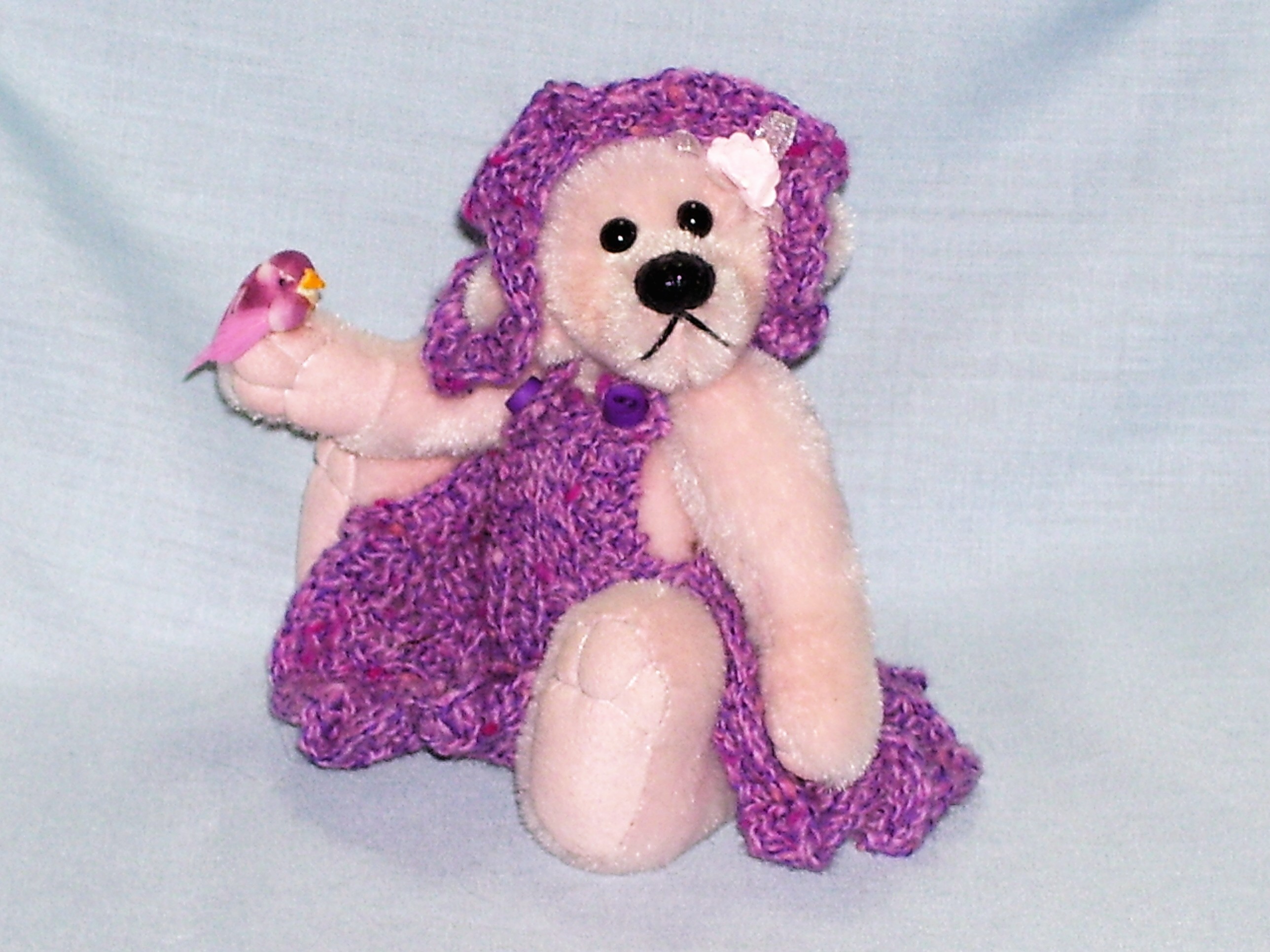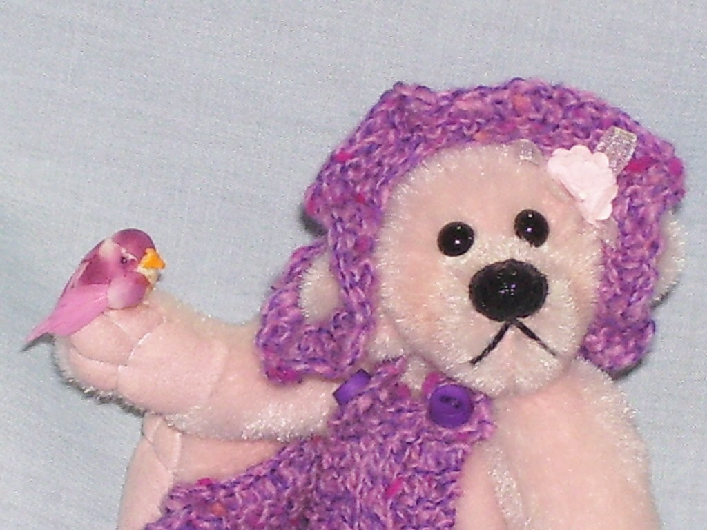 Candy loves nature. She is 4" in height from sitting and is made from long pile pink velvet and has ultra suede hand needle sculpted paws. She is weighted with glass beads, has a hand stitched glossed nose and glass eyes. Candy wears a mauve hand knitted dress and matching flower hat. She has a bow and flower on her head and comes with a tiny bird, one of her many friends. Adoption Fee : SORRY CANDY HAS BEEN ADOPTED