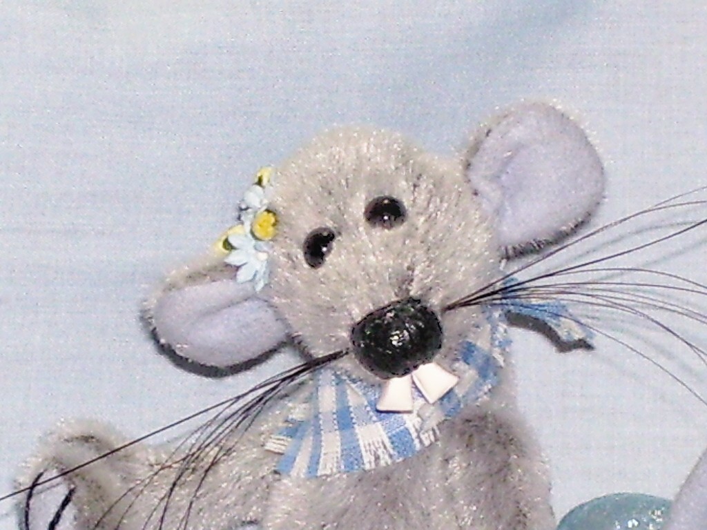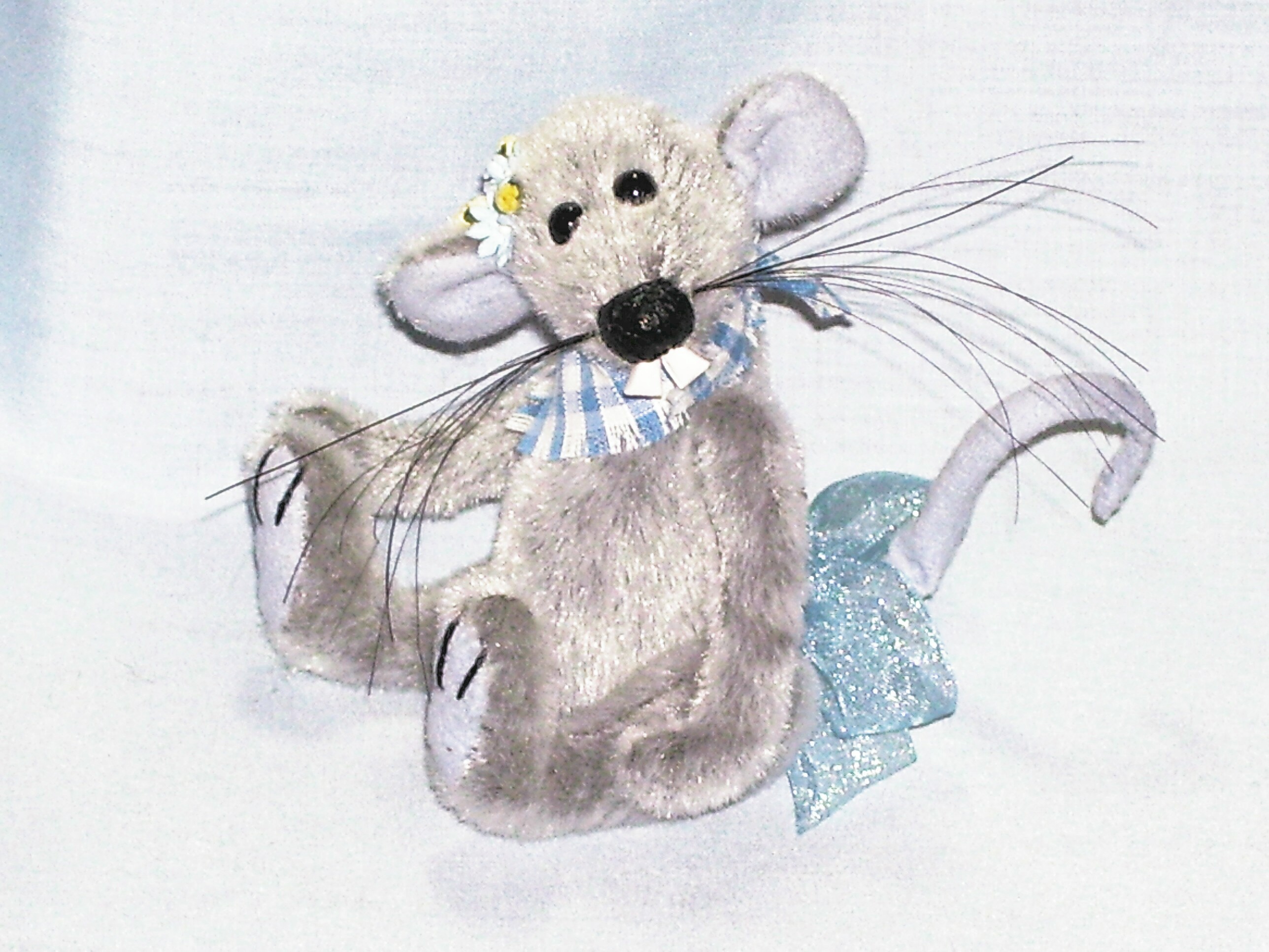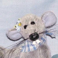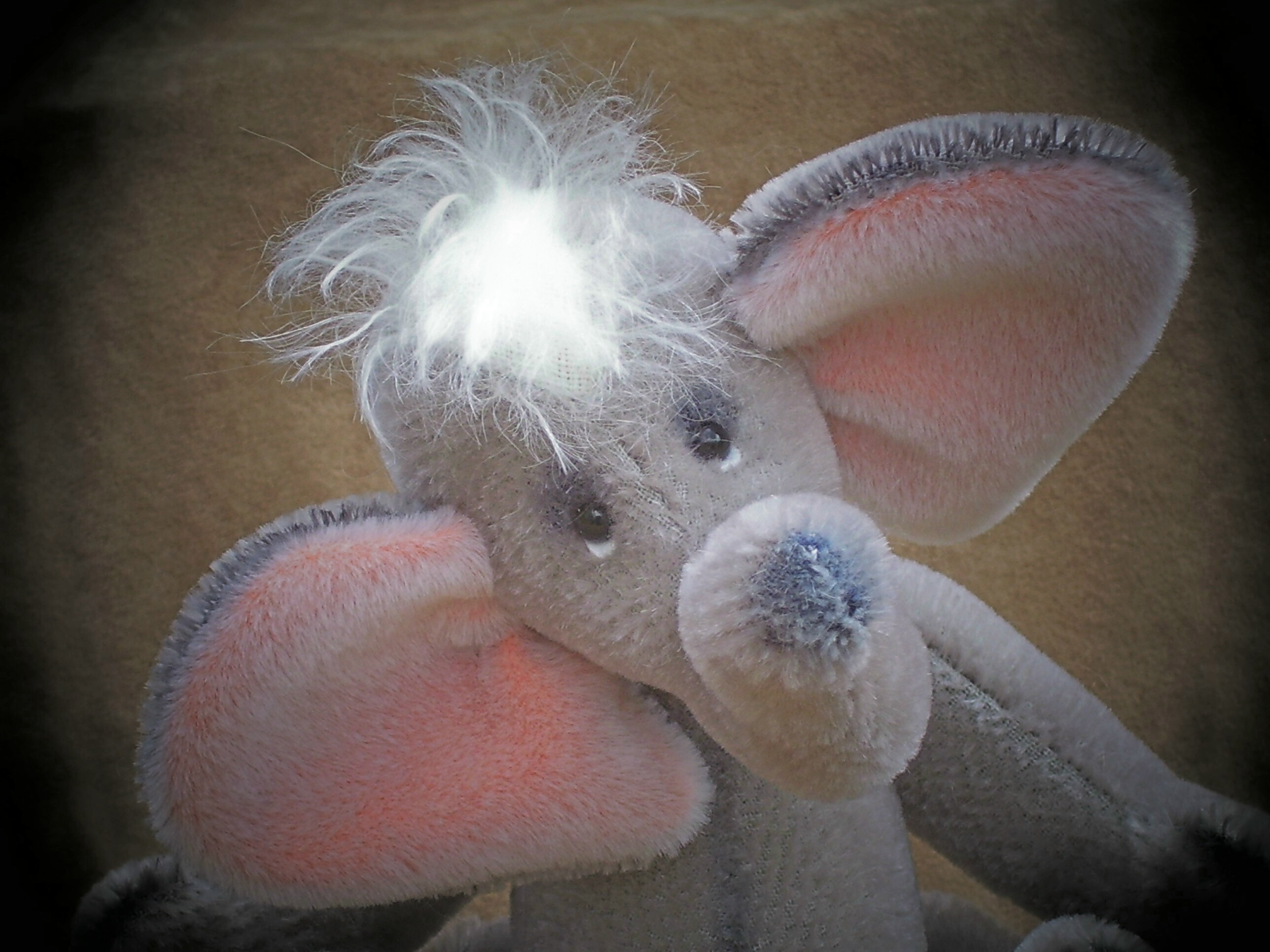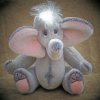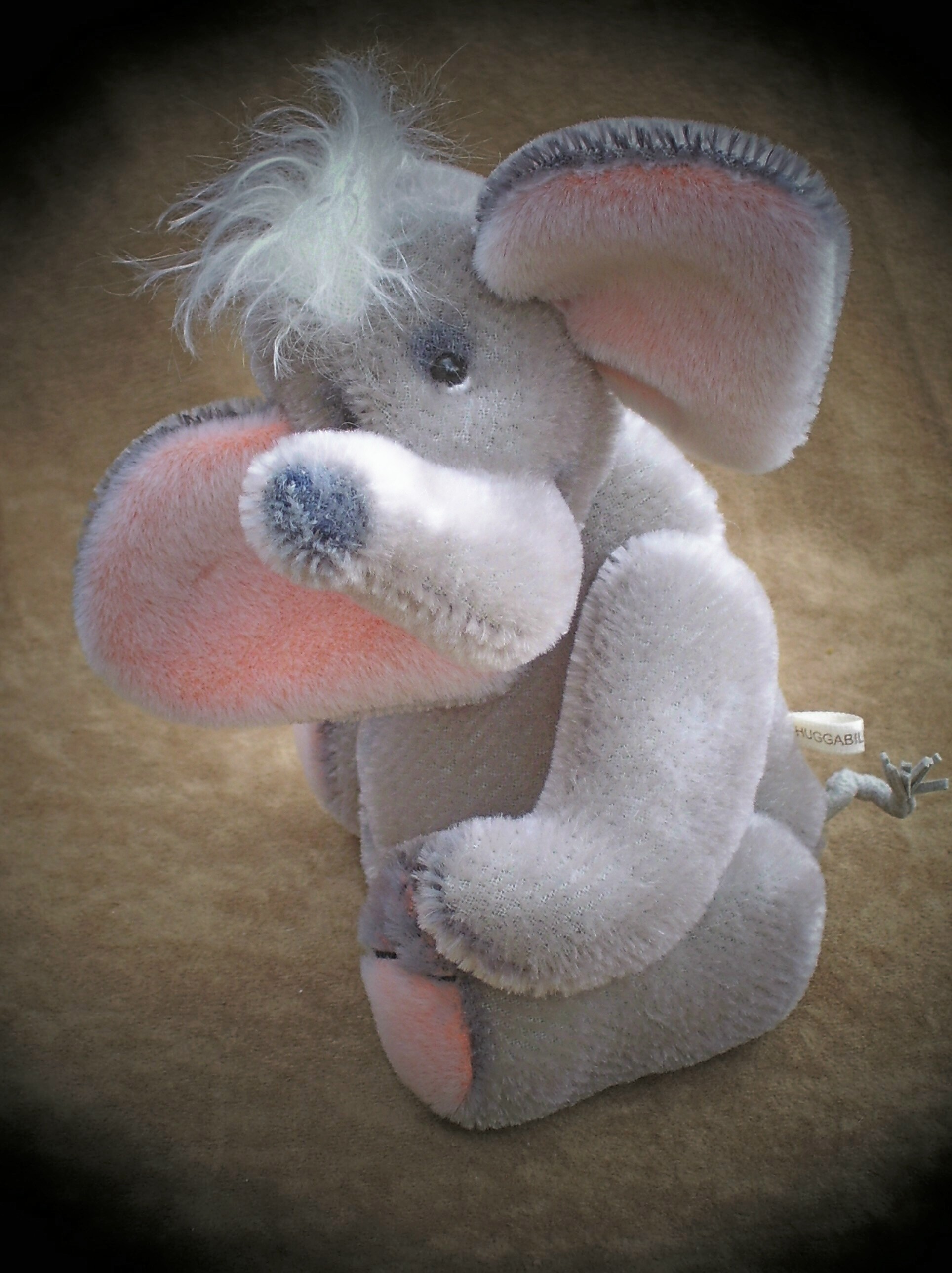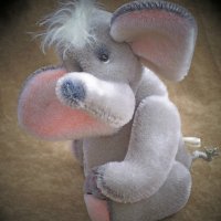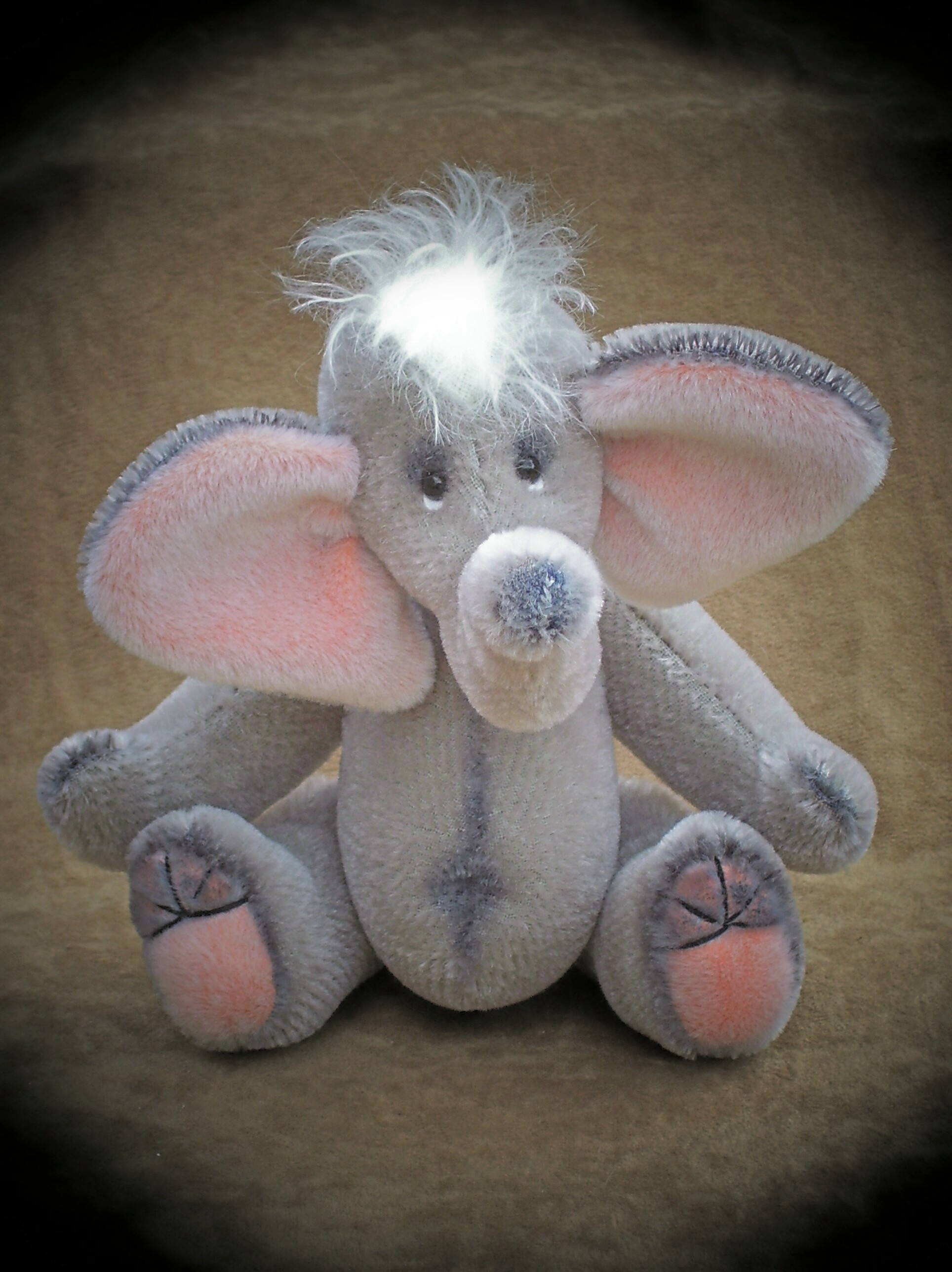 Eddie The Elephant, sister to Eliza is also a chunky little hug. He is 6" in height from sitting and is made from short grey semi - sparse mohair. Eddie has peach cashmere inner ear pads and paws. He has glass eyes and sports a lovely curly tuft of white hair made from long curly mohair. He is hand shaded and also has an adorable curly tail. Adoption Fee : SORRY EDDIE THE ELEPHANT HAS BEEN ADOPTED