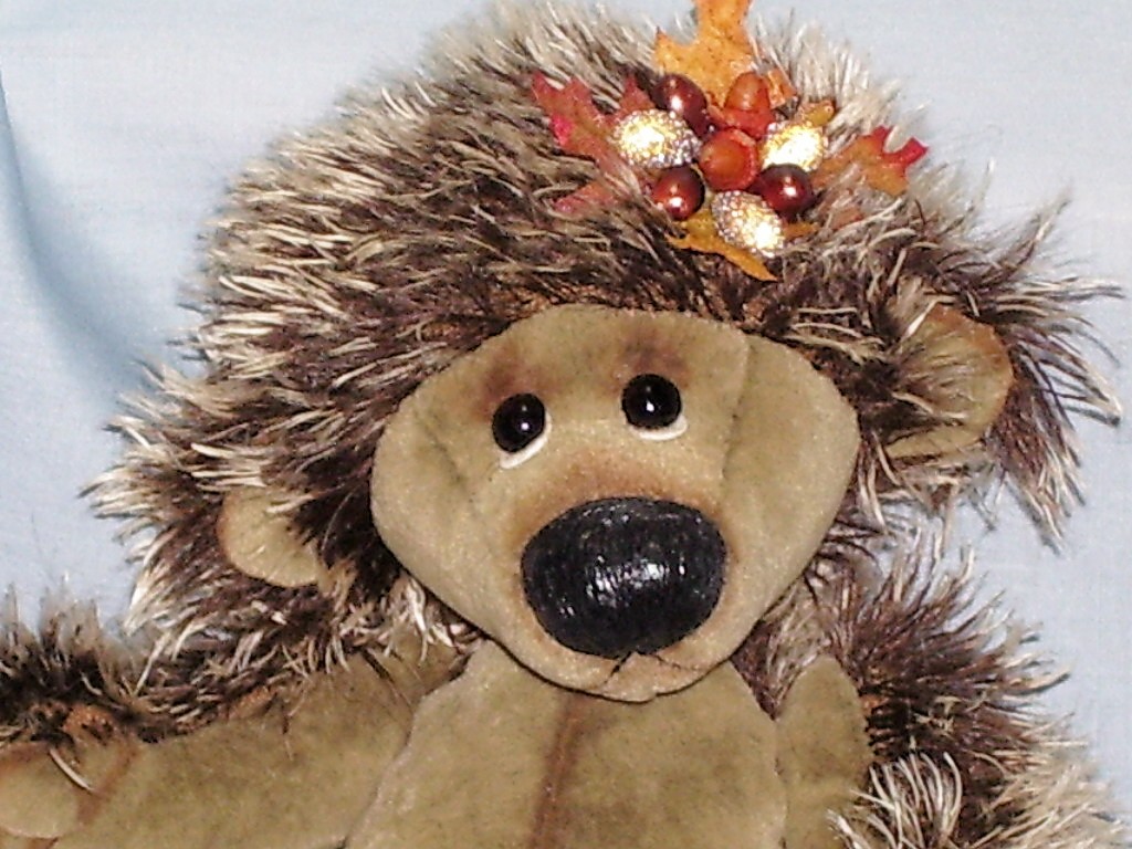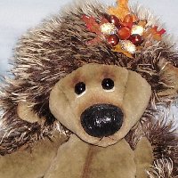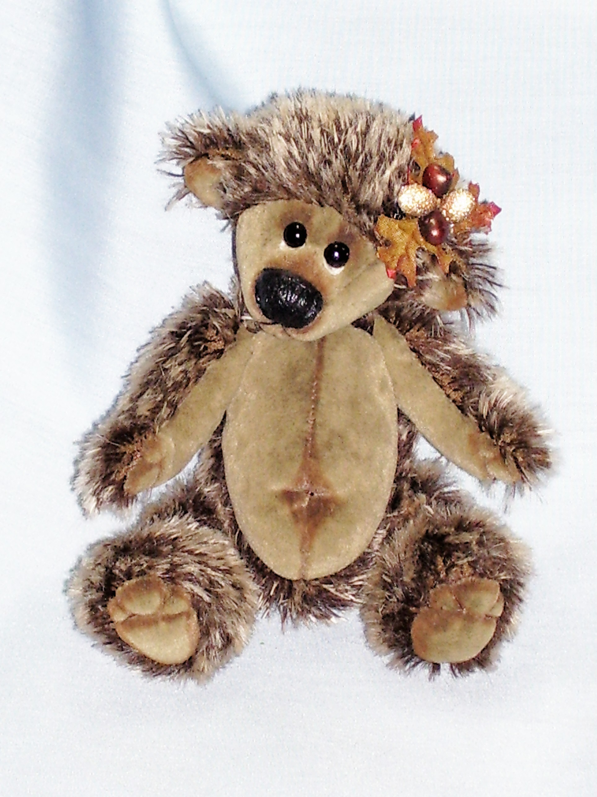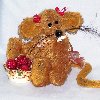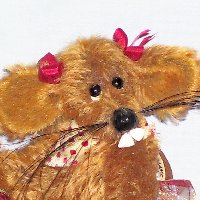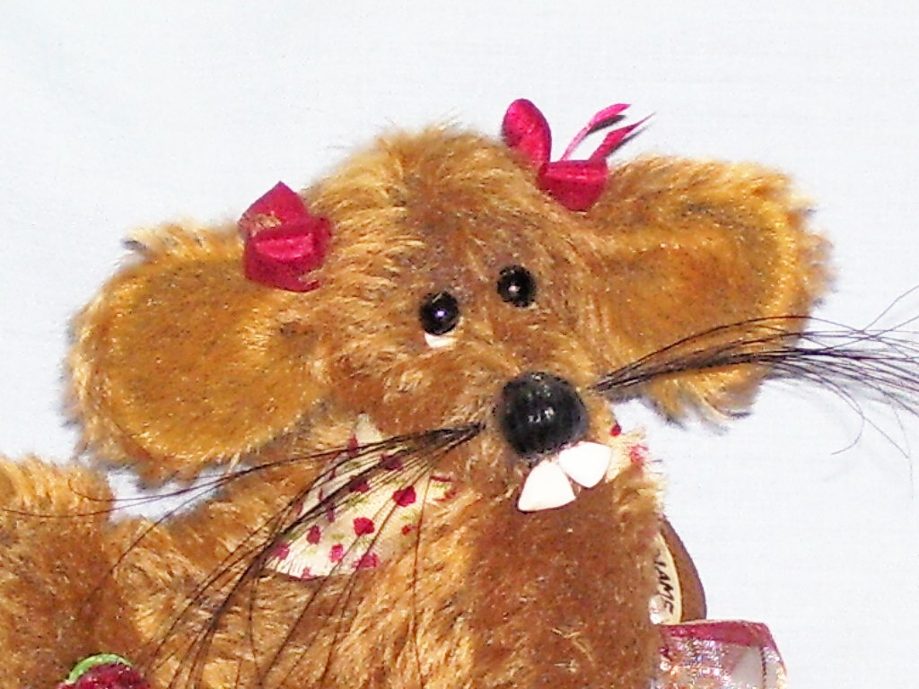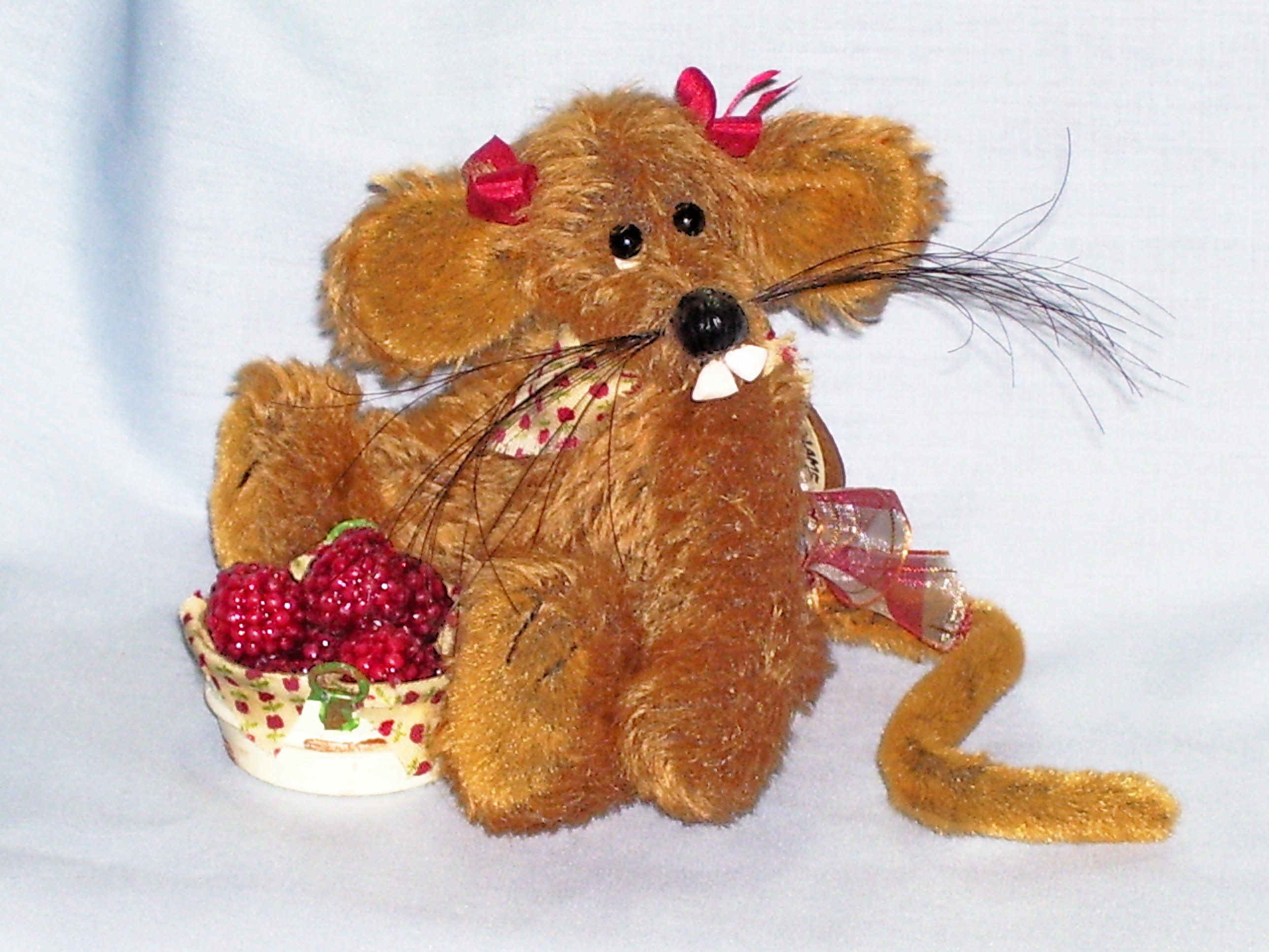 Ratafina is a country bumpkin rat that has been scrumping. She is 4" in height from sitting and is made from ginger semi sparse german sculte mohair. She has long pile velvet paws and a adorable long tail. Ratafina has glass eyes, a hand sewn nose that is glossed , white bucked teeth made from fimo and lovely long whiskers. She has pure silk red bows on her head, a bow on her tail, a neckerchief and comes with her spoils of a bowl of raspberries. Adoption Fee : SORRY RATAFINA HAS BEEN ADOPTED